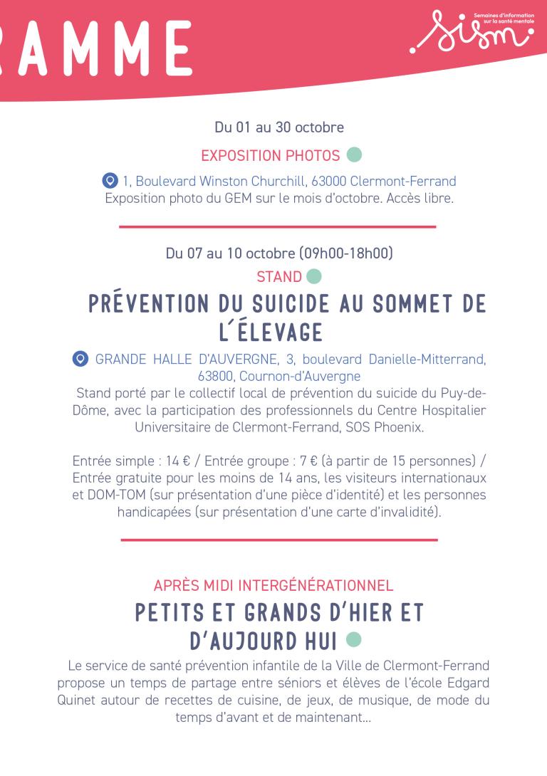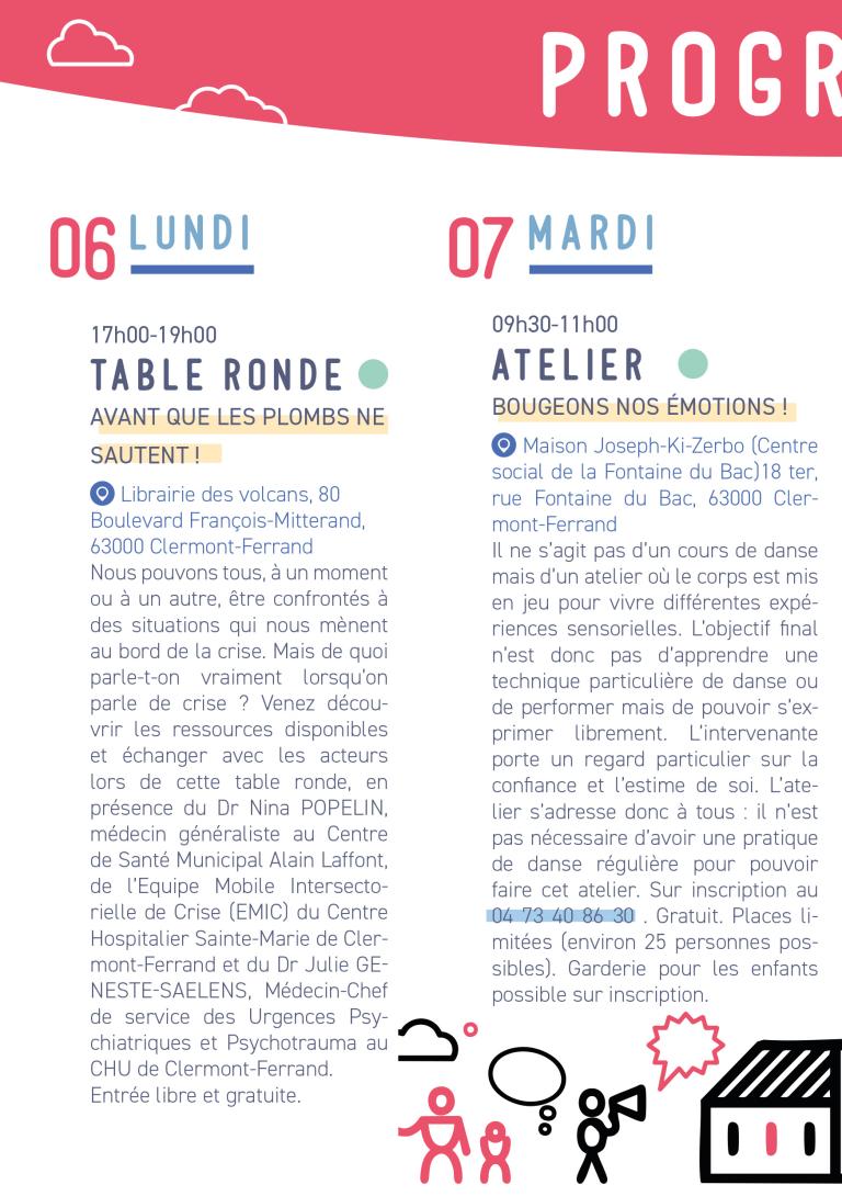 Nous pouvons tous, à un moment ou à un autre, être confrontés à des situations qui nous mènent au bord de la crise. Mais de quoi parle-t-on vraiment lorsqu’on parle de crise ? Venez découvrir les ressources disponibles et échanger avec les acteurs lors de cette table ronde, en présence du Dr Nina POPELIN, médecin généraliste au Centre de Santé Municipal Alain Laffont, de l’Equipe Mobile Intersectorielle de Crise (EMIC) du Centre Hospitalier Sainte-Marie de Clermont-Ferrand et du Dr Julie GENESTE-SAELENS, Médecin-Chef de service des Urgences Psychiatriques et Psychotrauma au CHU de Clermont-Ferrand.