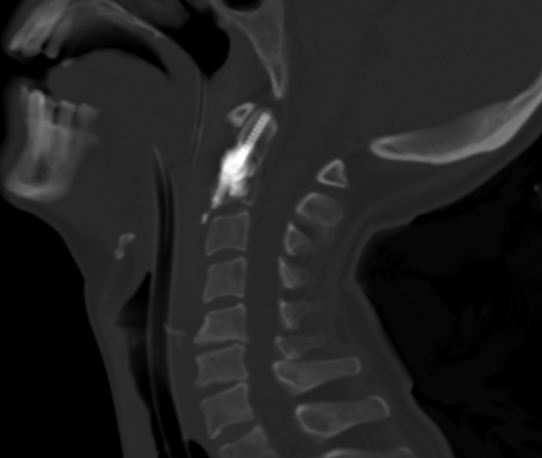 L’objectif de l’intervention était de stabiliser une zone fragilisée, à proximité immédiate de la moelle épinière, afin de réduire rapidement les douleurs, de permettre le retrait de la minerve et de restaurer l’autonomie de la patiente.