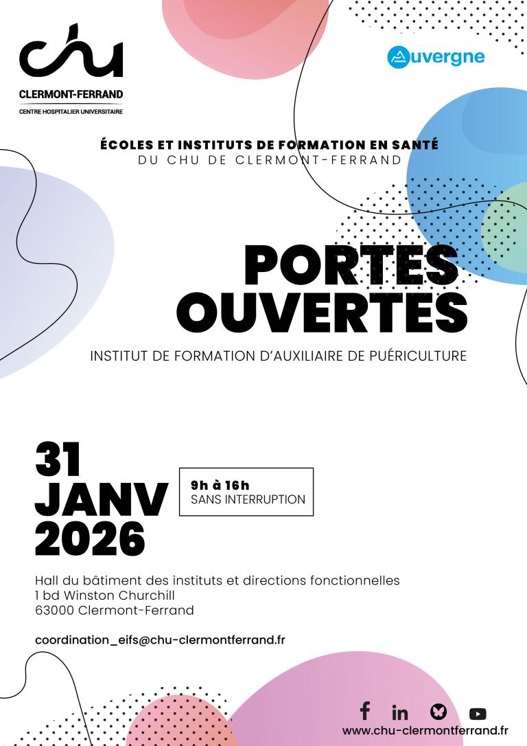 Nous avons le plaisir de vous informer que l'Institut de Formation des Auxiliaires de Puériculture du CHU de Clermont-Ferrand organise des Journées Portes Ouvertes