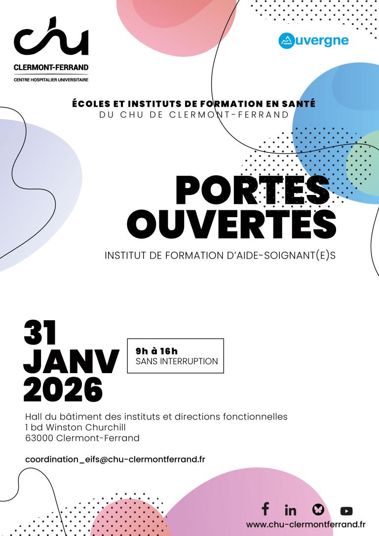 Nous avons le plaisir de vous informer que l'Institut de Formation des Aides-Soignants du CHU de Clermont-Ferrand organise des Journées Portes Ouvertes
