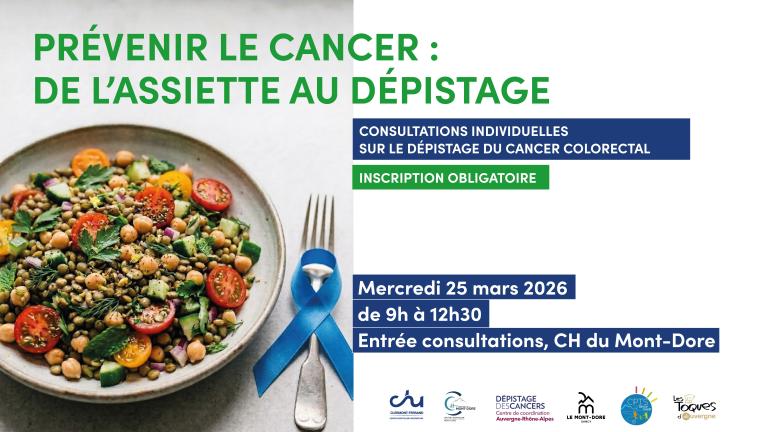 • Des entretiens de prévention individuels (sur inscription) seront proposés par l’équipe du CRCDC le lendemain, mercredi 25 mars (9h-12h30), au Centre hospitalier du Mont-Dore, avec la possibilité de récupérer son kit de dépistage colorectal et d’échanger sur la santé gynécologique (mammographie et dépistage du col de l’utérus).