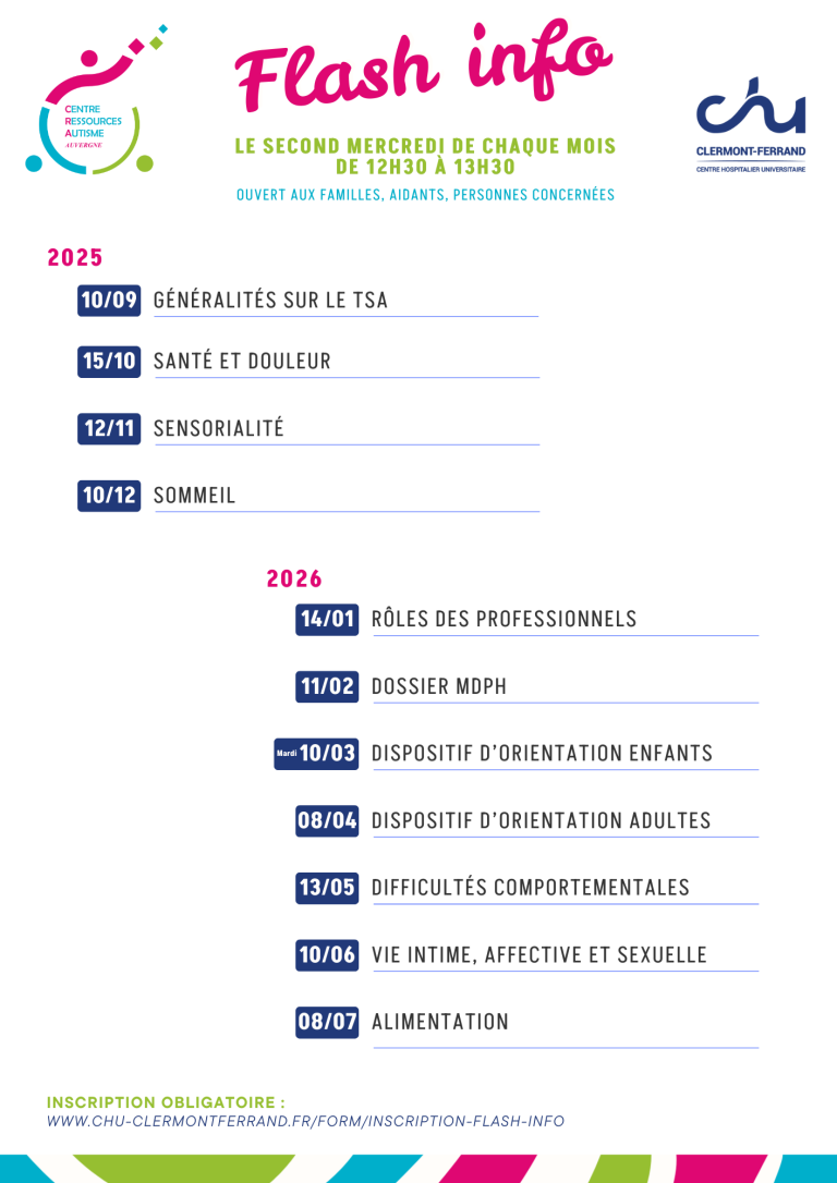 Programme Flash info Comprendre l'autisme C'est quoi l'autisme ? Je m'interroge ? Quelles évaluations ? Quel accompagnement ? Je me forme Pour aller plus loin Le CRA en Auvergne Présentation CRA Auvergne et son réseau Services proposés Centre de documentation L'équipe Nos engagements Nous suivre Diagnostic en Auvergne Qui solliciter ? Accompagnement en Auvergne Associations Structures spécifiques et Equipes Mobiles Autisme MDPH Faciliter le quotidien La maison L'école Les loisirs La santé La vie affective La communication L'accès au travail L'accès au logement Le répit Pour les professionnels Diagnostic au CRA Réseaux professionnels Formations Actualités Du CRA En Auvergne Nationales et Internationales Autres partager imprimer Inscription : https://www.chu-clermontferrand.fr/form/inscription-flash-info