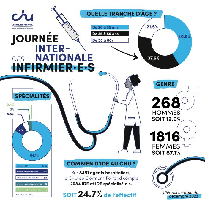 … Envoyer × Vie du CHU … Journée internationale des infirmieres … Publié le 12 mai 2023 partager imprimer … découvrez quelques chiffres clés pour en savoir un peu plus sur ce formidable métier … Le saviezvous … Sur 8451 agents hospitaliers le CHU compte 2084 IDE et IDE Spécialisés soit 247 IDE Infirmiere …