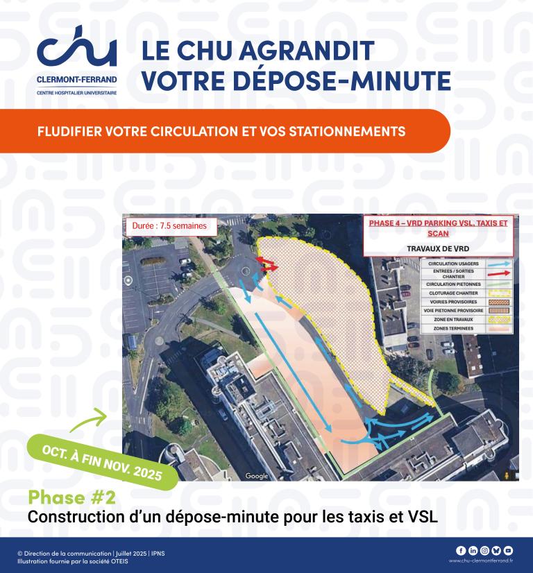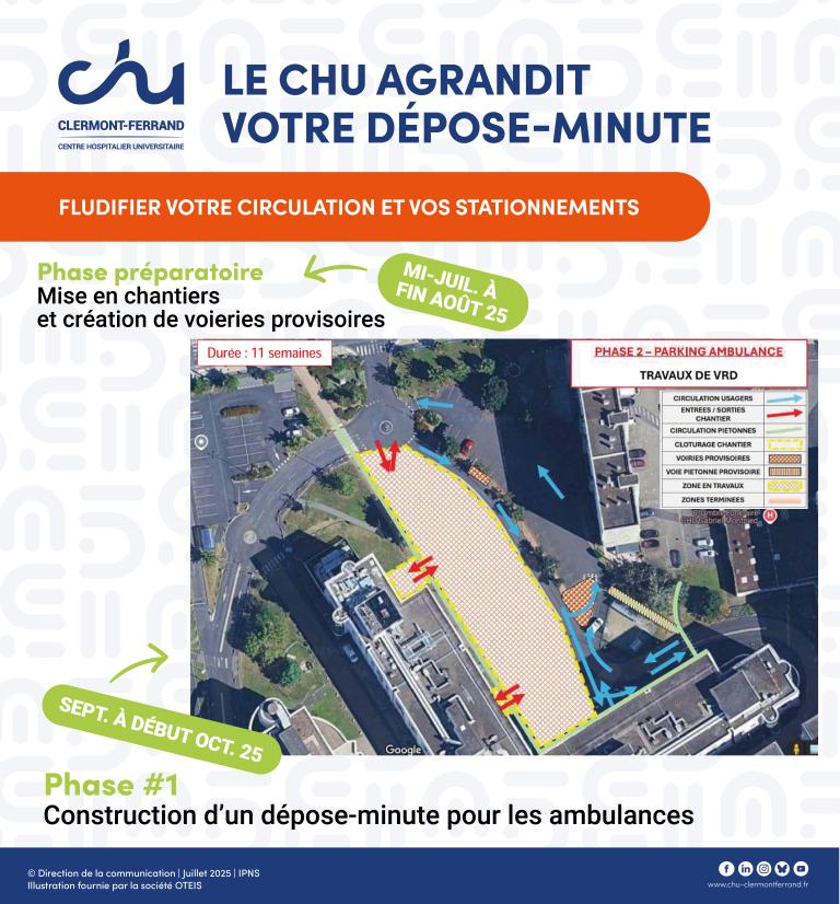 Dans le cadre de l’amélioration du dépose-minute, des travaux conséquents sont lancés dès la mi-juillet. Ces travaux, qui dureront près de 6 mois, permettront de fluidifier la circulation des ambulances privées, véhicules sanitaires légers (VSL) et taxis mais aussi pour l’accès pour des transports sanitaires du CHU. Le dépose-minute sera ainsi à la fin des travaux exclusivement dédié aux flux professionnels hors urgences, offrant une zone de stationnement à durée limitée réservée aux ambulances.